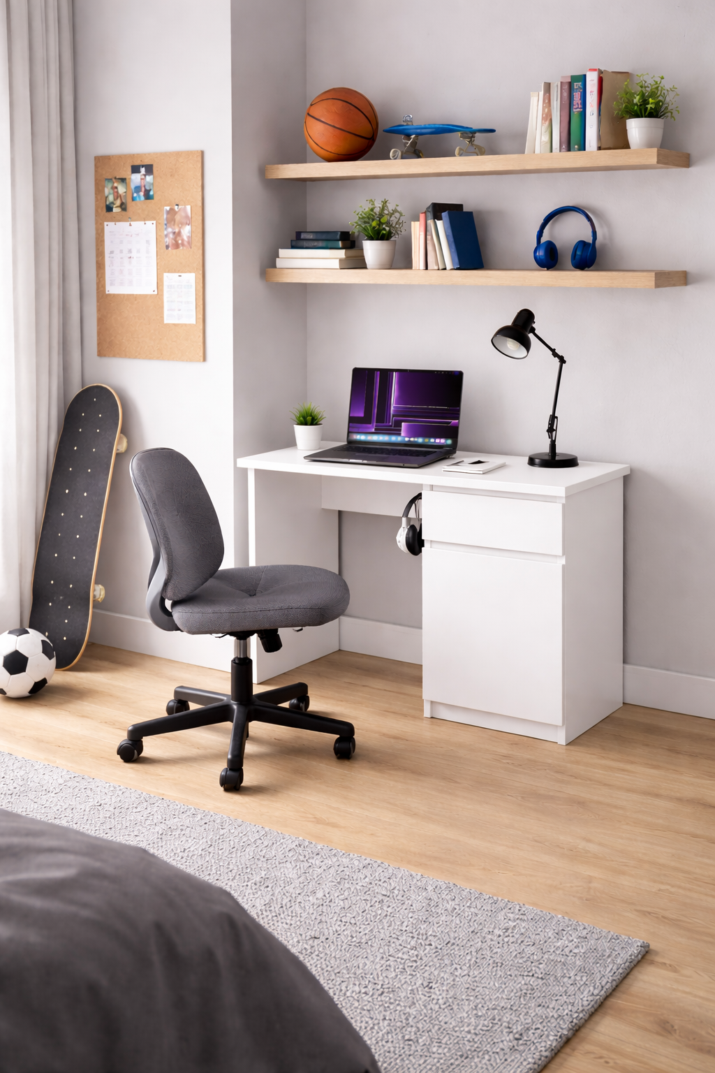 To praktyczne biurko łączy prosty, nowoczesny design z wysoką funkcjonalnością, tworząc wygodne miejsce do pracy i nauki w każdym wnętrzu.