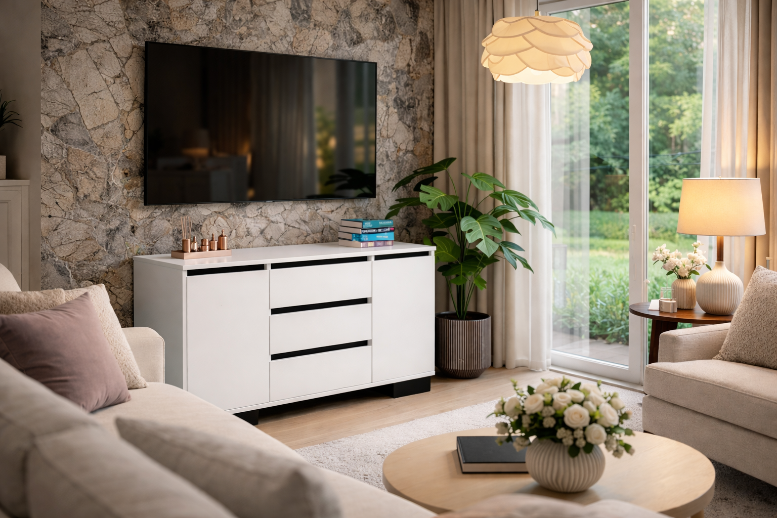 Komoda została wykonana w całości z płyty meblowej klasy premium Swiss Krono o grubości 18 mm. To materiał ceniony za trwałość, stabilność konstrukcyjną oraz estetyczne wykończenie powierzchni.