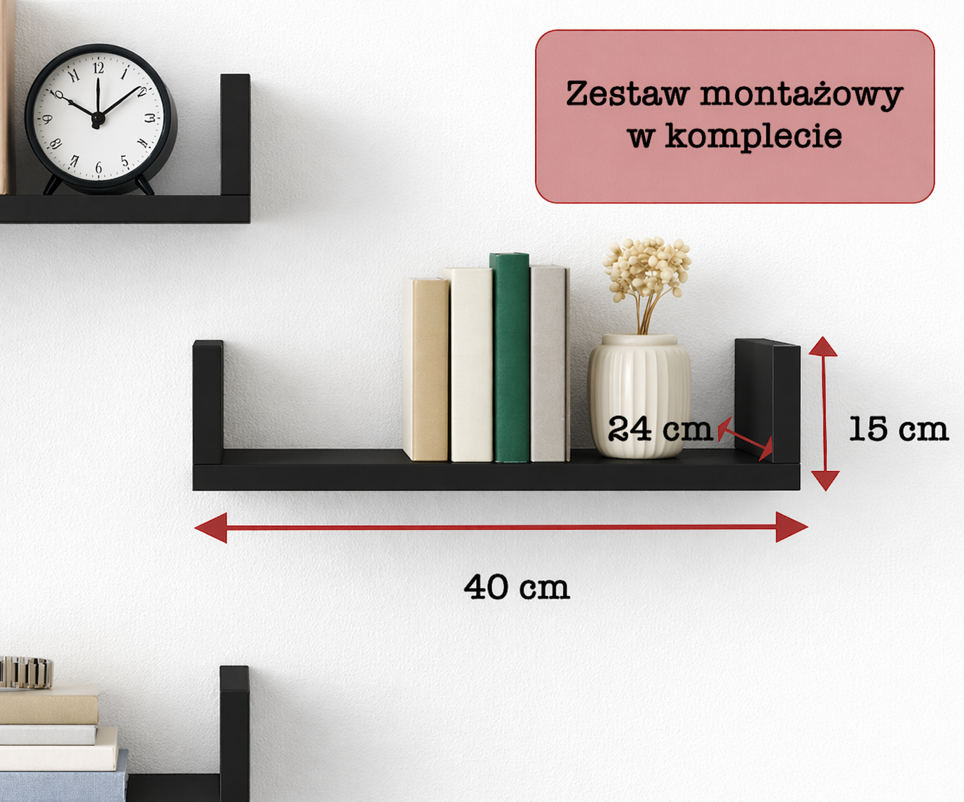 Każda półka ma 40 cm szerokości, 24 cm głębokości i 15 cm wysokości, co oznacza, że bez problemu ustawisz na nich książki bez ryzyka wystawania poza krawędź. Kompaktowy rozmiar sprawia, że świetnie sprawdzą się również w mniejszych przestrzeniach, gdzie liczy się każdy centymetr.