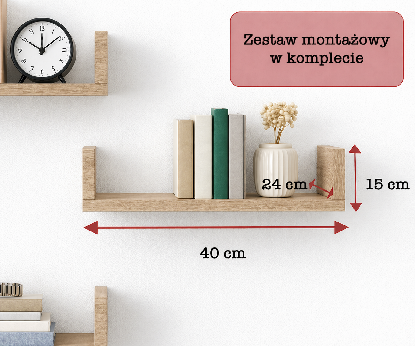 Każda półka ma 40 cm szerokości, 24 cm głębokości i 15 cm wysokości, co oznacza, że bez problemu ustawisz na nich książki bez ryzyka wystawania poza krawędź. Kompaktowy rozmiar sprawia, że świetnie sprawdzą się również w mniejszych przestrzeniach, gdzie liczy się każdy centymetr.