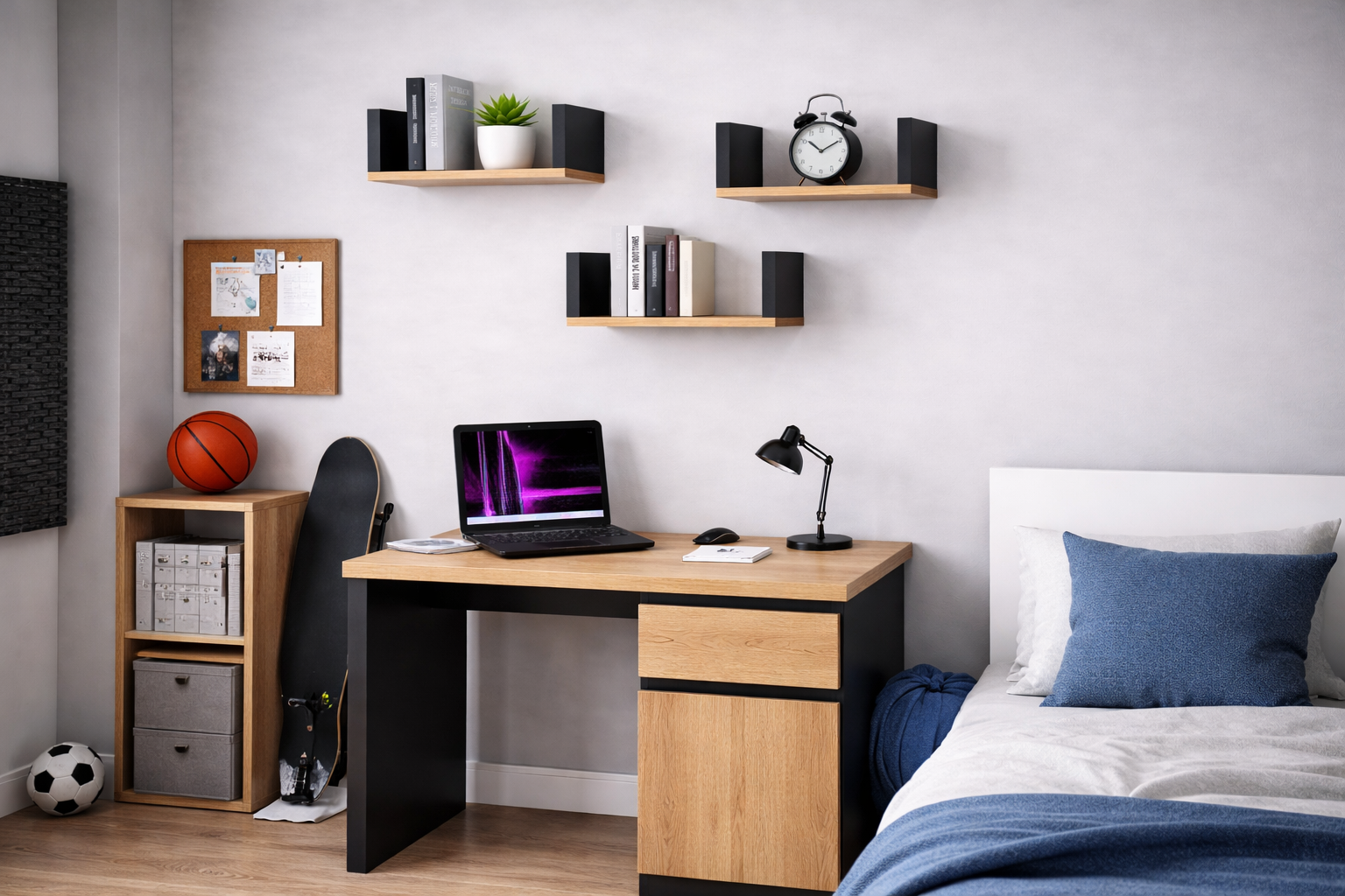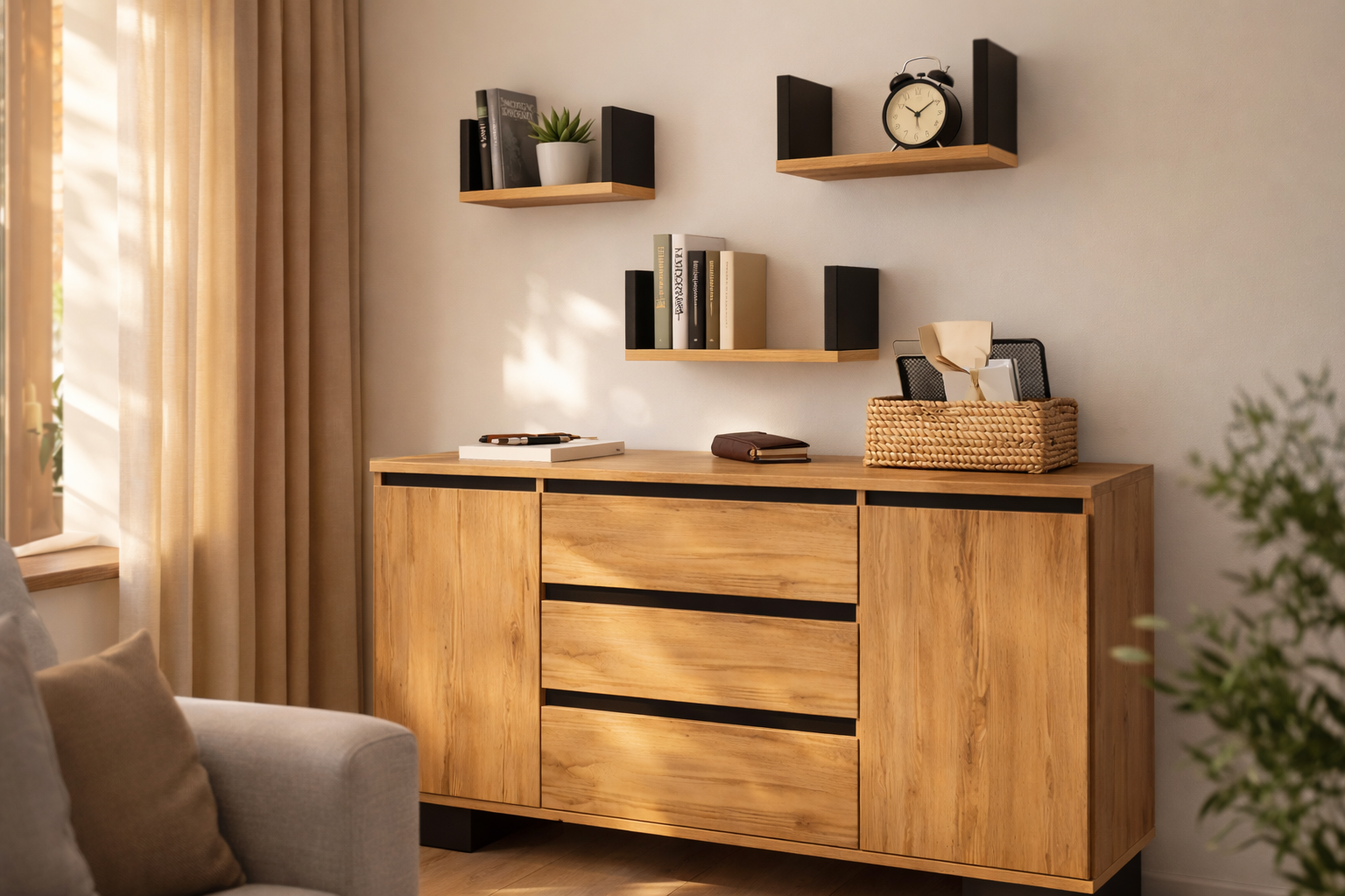 Szukasz prostego sposobu na uporządkowanie przestrzeni i jednocześnie wyrazisty akcent we wnętrzu? Nasze półki ścienne w połączeniu dąb Wotan i czerni to idealna propozycja do nowoczesnych, loftowych i industrialnych aranżacji. Naturalny rysunek drewna dąb Wotan nadaje wnętrzu ciepła, a czarne elementy wprowadzają elegancki, zdecydowany charakter.