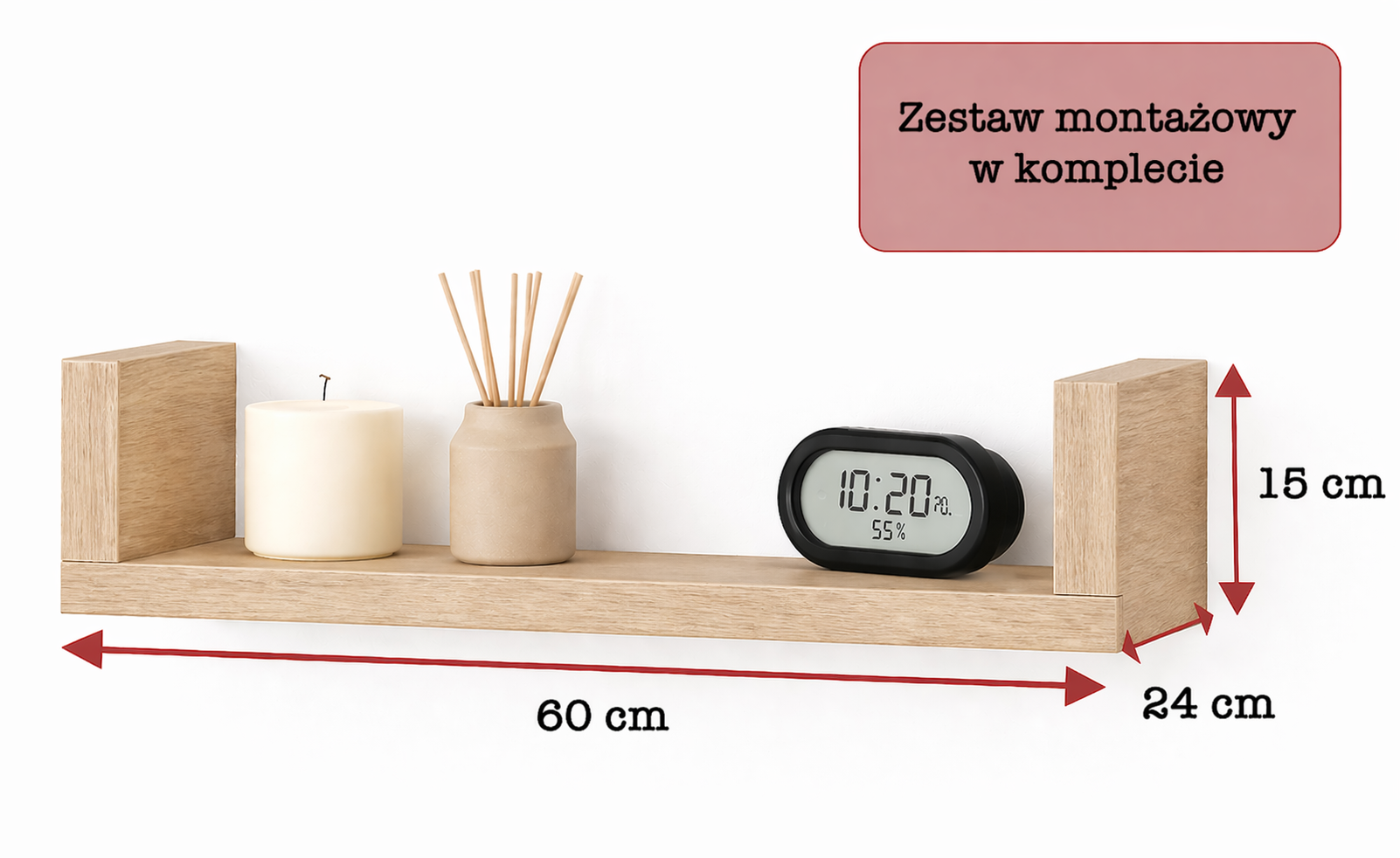 Każda półka ma 60 cm szerokości, przy zachowaniu 24 cm głębokości i 15 cm wysokości, co daje więcej przestrzeni na książki, dekoracje czy rośliny. To rozwiązanie idealne dla osób, które chcą maksymalnie wykorzystać powierzchnię ściany bez utraty estetyki.