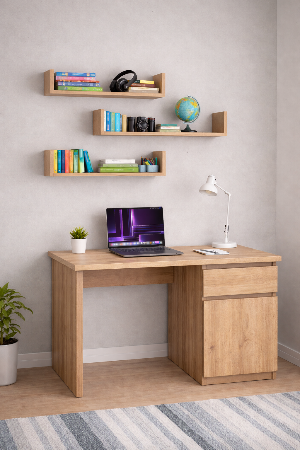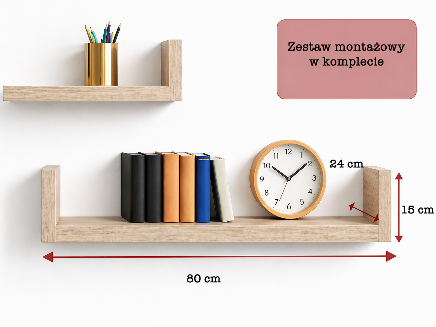 Każda półka ma aż 80 cm szerokości, przy zachowaniu 24 cm głębokości i 15 cm wysokości, co daje dużą powierzchnię użytkową. Bez problemu pomieszczą książki, dekoracje, rośliny czy inne akcesoria codziennego użytku.