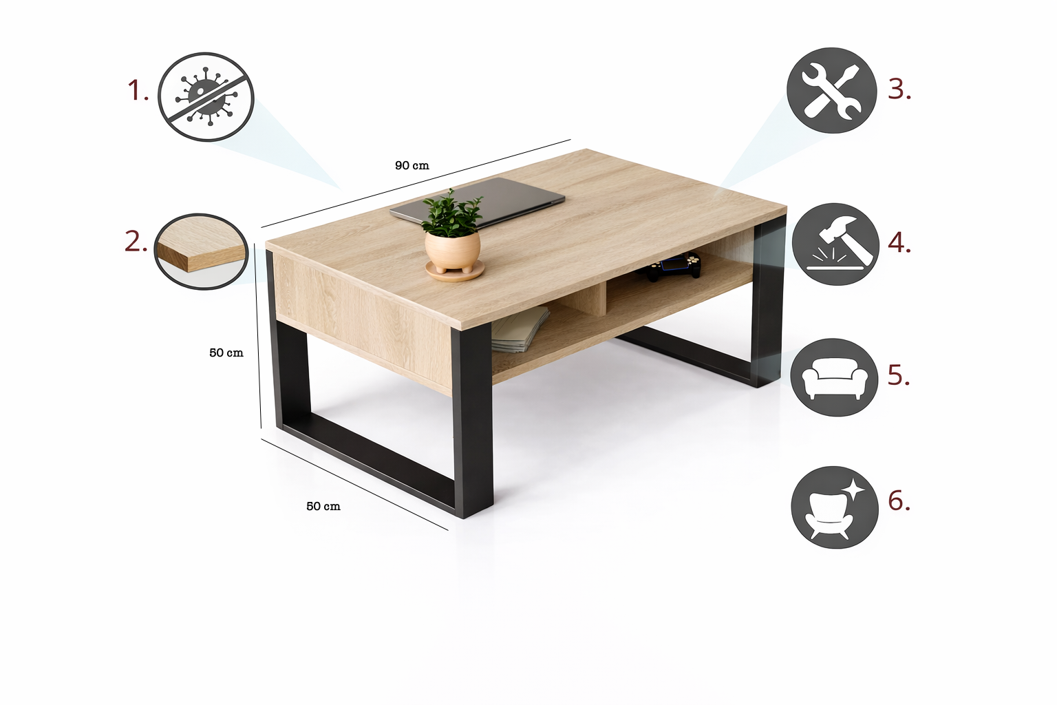 Dzięki dodatkowej dolnej półce jest niezwykle użytecznym elementem każdego pokoju. Niezwykle nowoczesna i przemyślana konstrukcja zapewnia stolikowi stabilność i niepowtarzalny wygląd.