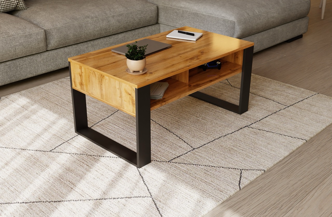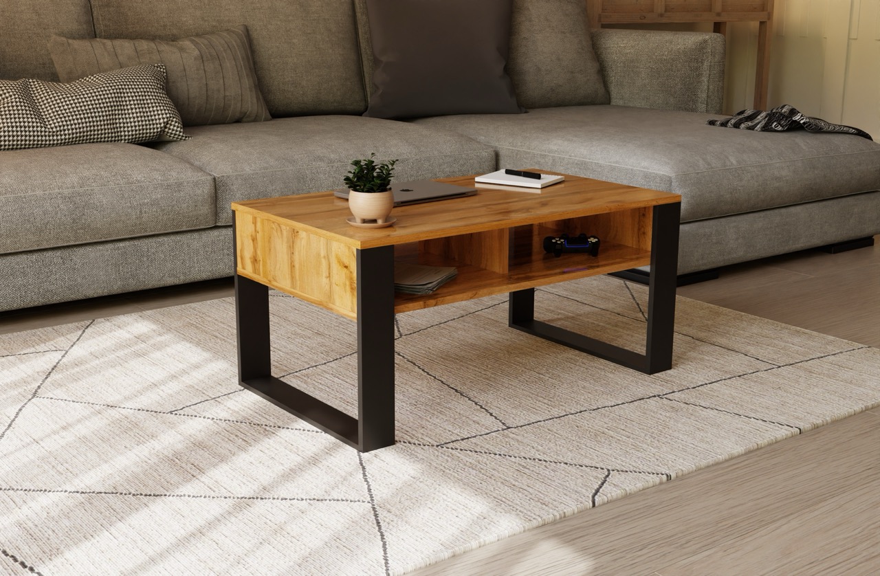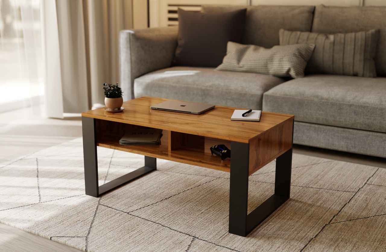 Wyrazista struktura drewna i nowoczesny kontrast. Stolik kawowy ST7 w kolorze Dąb Wotan z czarnymi nogami to elegancka propozycja do salonów w stylu loftowym i nowoczesnym.