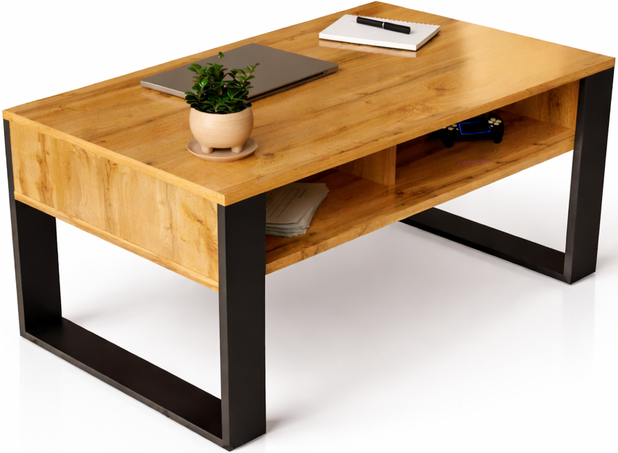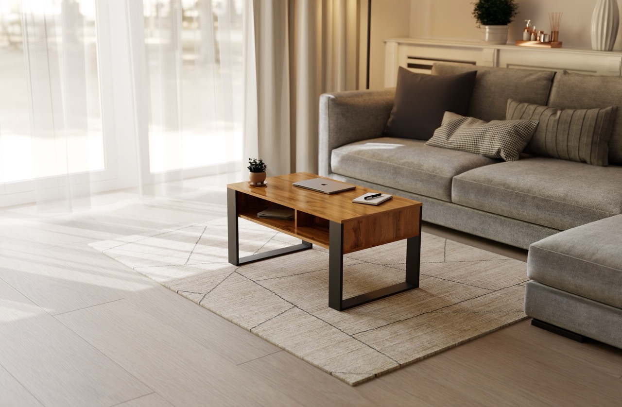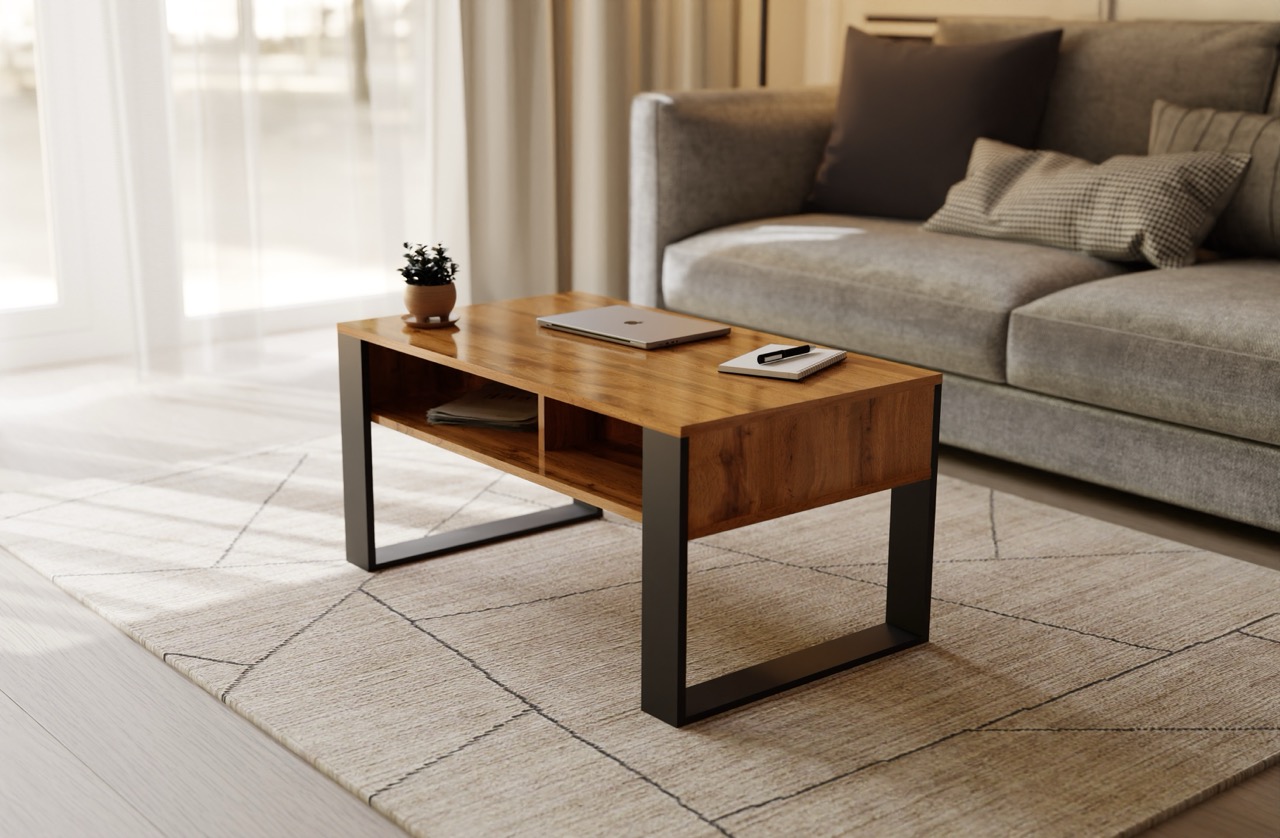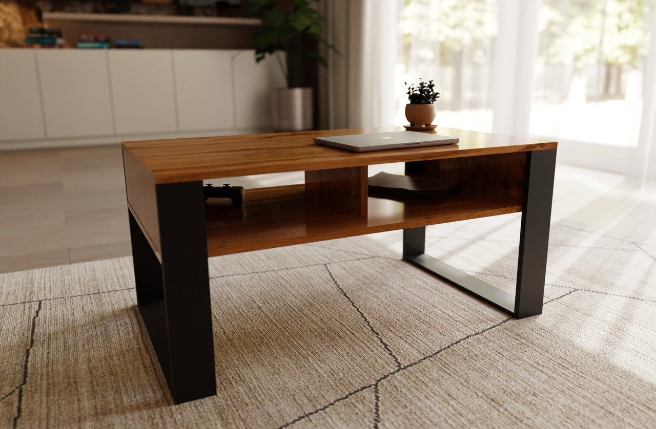 Wyrazista struktura drewna i nowoczesny kontrast. Stolik kawowy ST7 w kolorze Dąb Wotan z czarnymi nogami to elegancka propozycja do salonów w stylu loftowym i nowoczesnym.